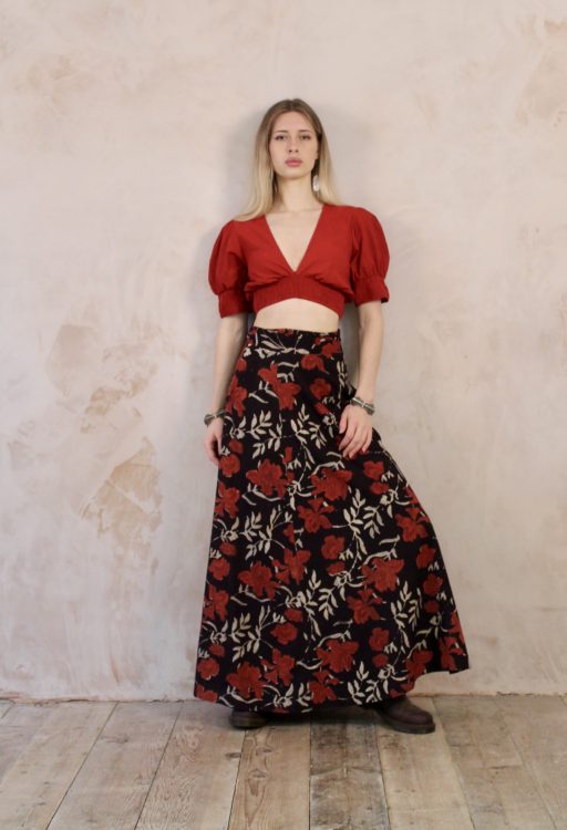 The front and back are constructed in a crossing / crossing V shape. There is ample room for boobs at the front and the dress has a moderately low back. The sleeves are wide cap sleeves and can be buttoned up with a loop concealed inside the sleeve to add an extra detail. There is a wide empire line or high waist band down from which the dress hangs straight down and hugs the body.