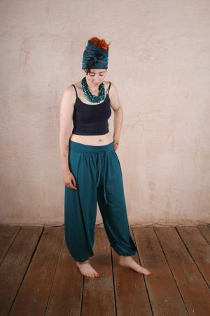 The Bubble trousers have a wide waistband with a cotton lycra drawstring inside. They are gently pleated at the front and back to allow for stretch and taper with a clever fold into an elasticated ankle cuff. This fold makes such a flattering shape on the front of the trousers as vertical lines elongate the body.