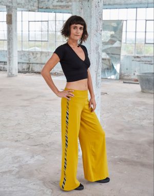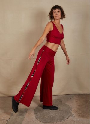 The waistband is wide and flattering with a thin elastic running inside the top of the waistband. A generous rise and a wide leg that skims the bum. Versatile, comfortable and super cool. Really easy to dress up or down. Go day time, night time, sporty or a tribal chic look! Available in Black, Mustard and Chilli Pepper Red SIZE GUIDE: I think this style came out slightly less generous in sizing than the regular palazzo pants I produce so I have sized it down slightly to single sizes based on UK measurements XS: 8 S : 10 M: 12 L: 14 XL: 16 XXL: 18 COMPOSITION: 100% Cotton lycra with 5% elastane, 180gsm. Fabric inset: organic, hand block printed cotton,natural dyes CARE :   Machine wash on cold using gentle detergent. This is to best care for the side strip which is naturally dyed. You can tumble dry it on low if you like. I do sometimes and the trousers will be fine. But tumble drying is not the best option for premium clothes care or saving energy