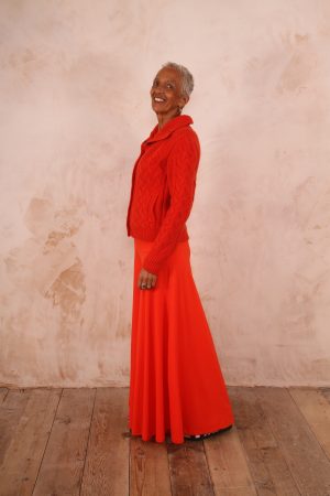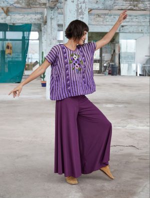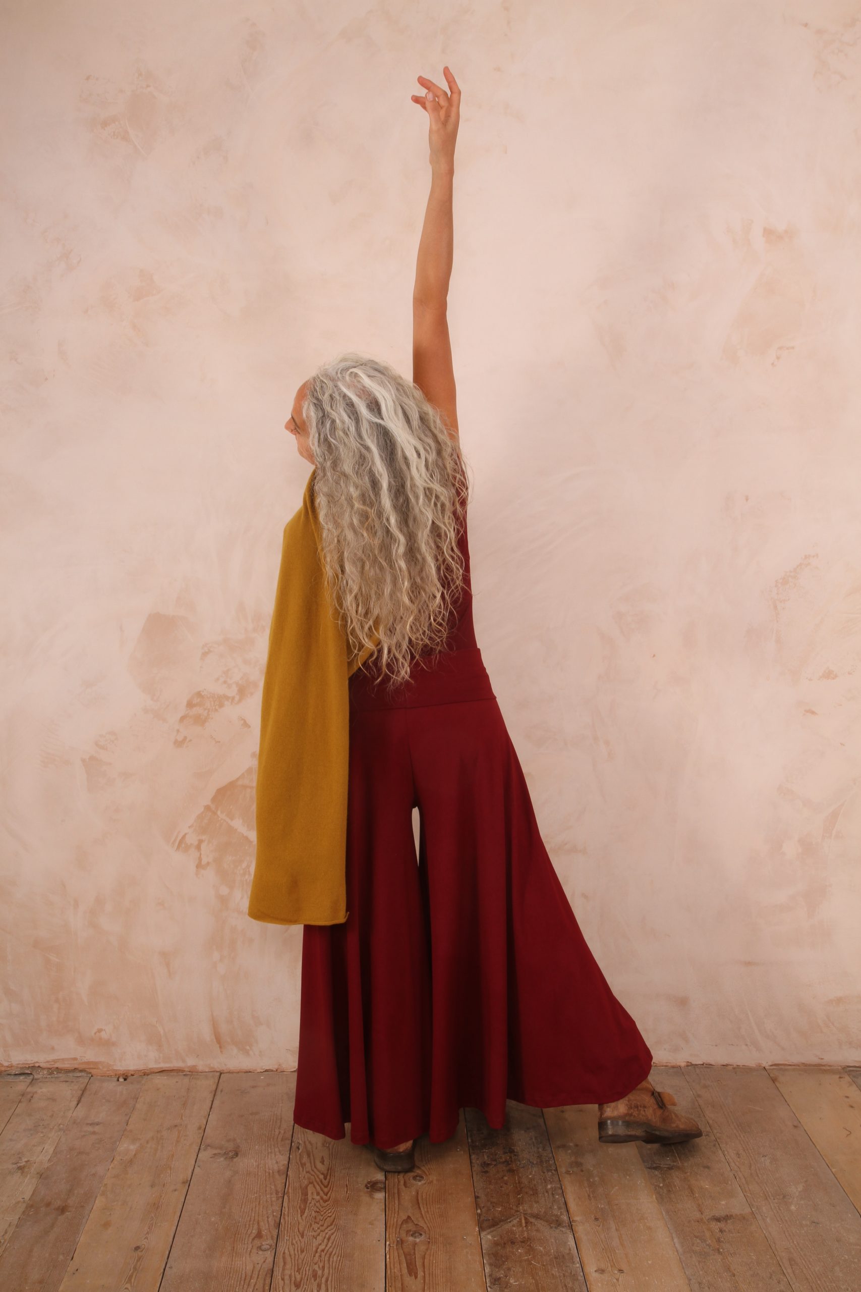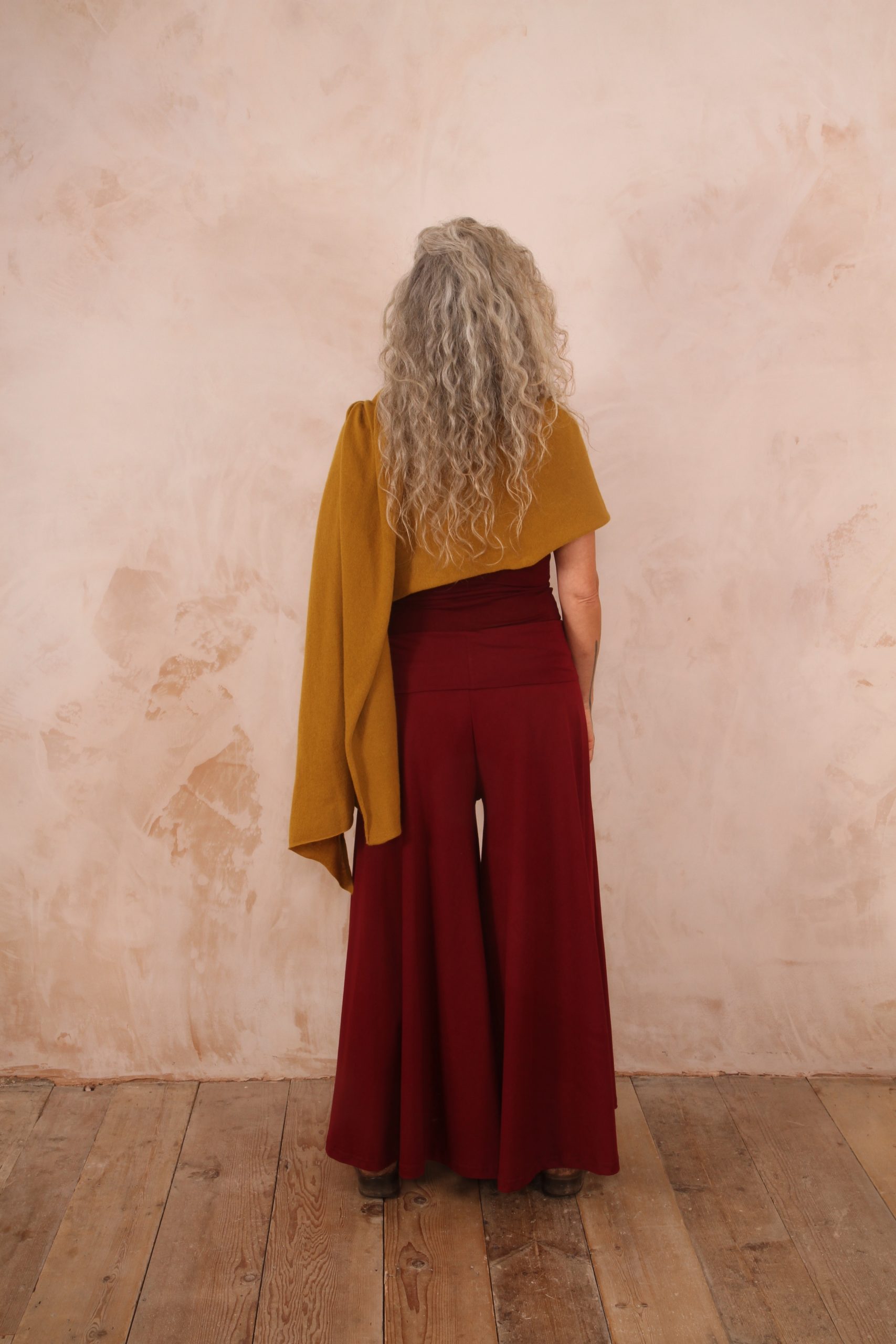 The Dancing Trousers are wide-leg trousers with a lot of elegance and drape and fluidity and movement in the way they hang on the body, hence the name! The trousers sit on the hips and have a wide waistband that folds over a tie belt.