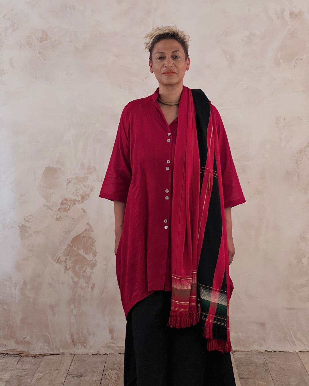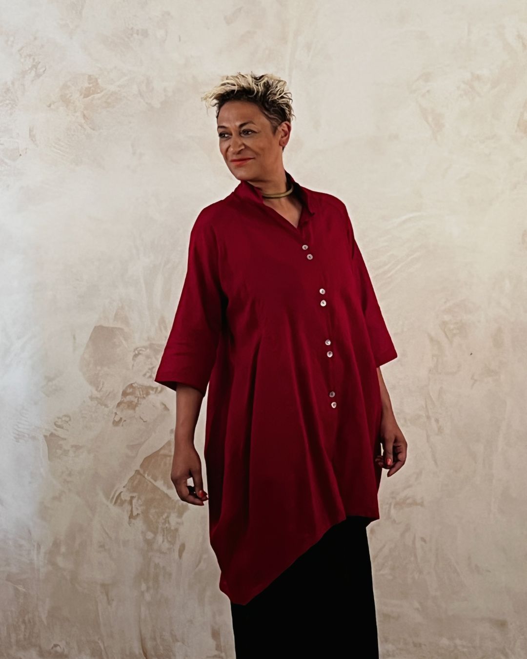 Made from a beautifully soft cotton voile, the Jasmine shirt is oversized and a Lagenlook shape. The shirt is loose and flattering. Panel detailing on the shoulders leads into a raglan sleeve . The sleeves are three quater length, emphasising the waist. The shirt is over the knee length and has a dipped hemline at the back. The natural shell buttons fasten with loops. The shirt has satisfyingly deep pockets