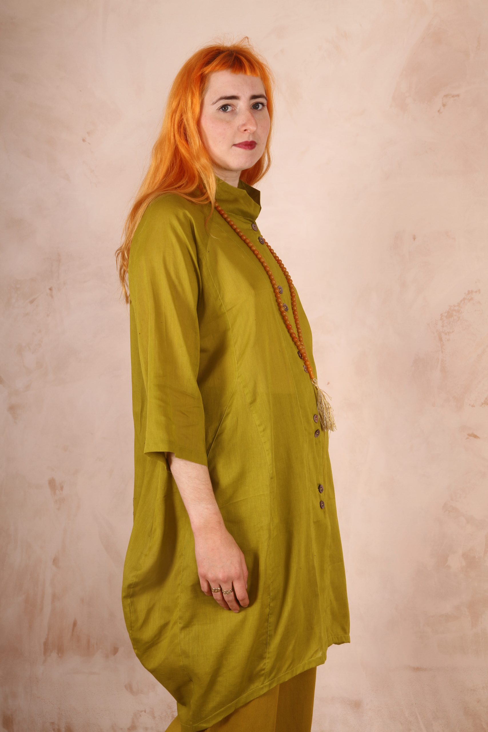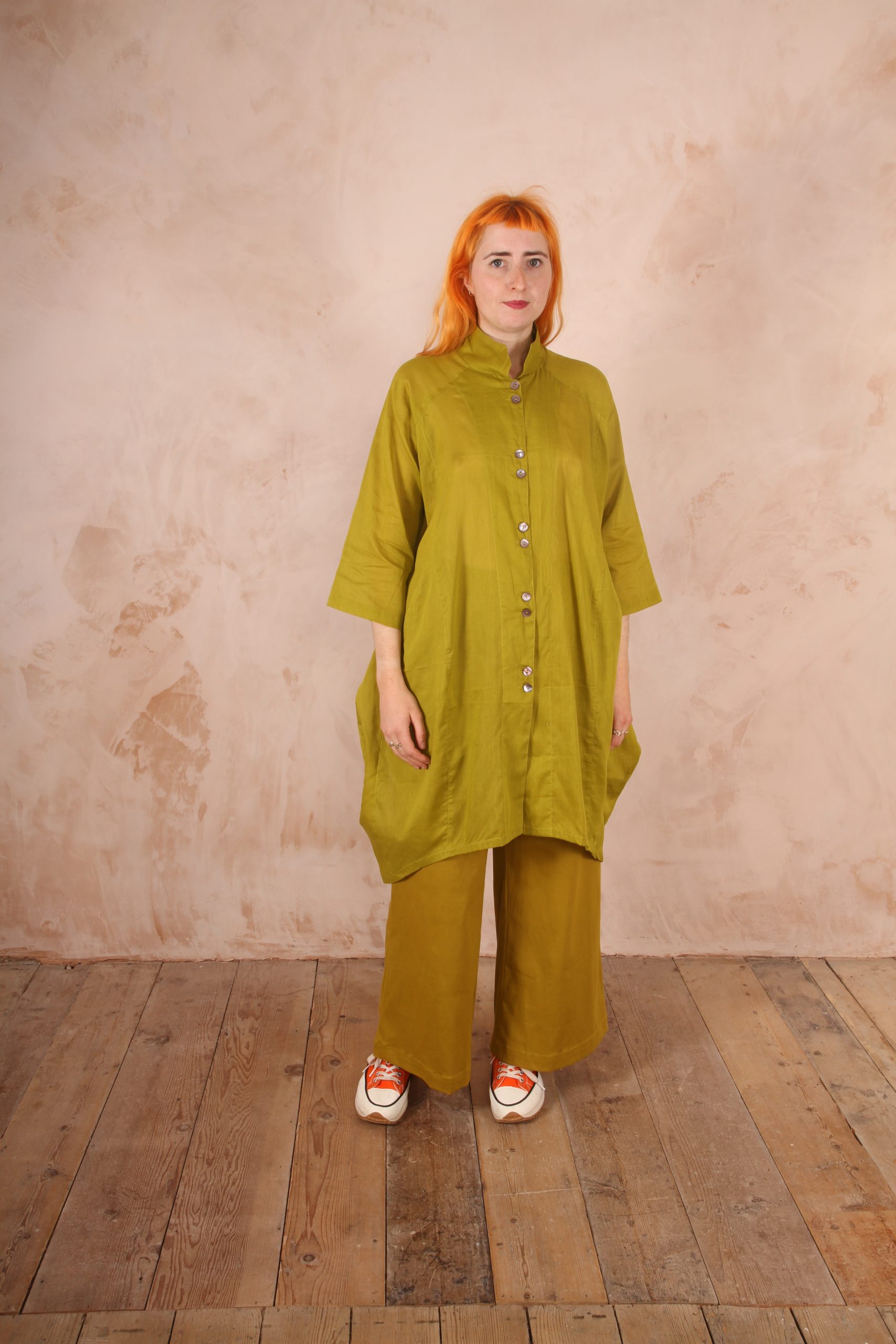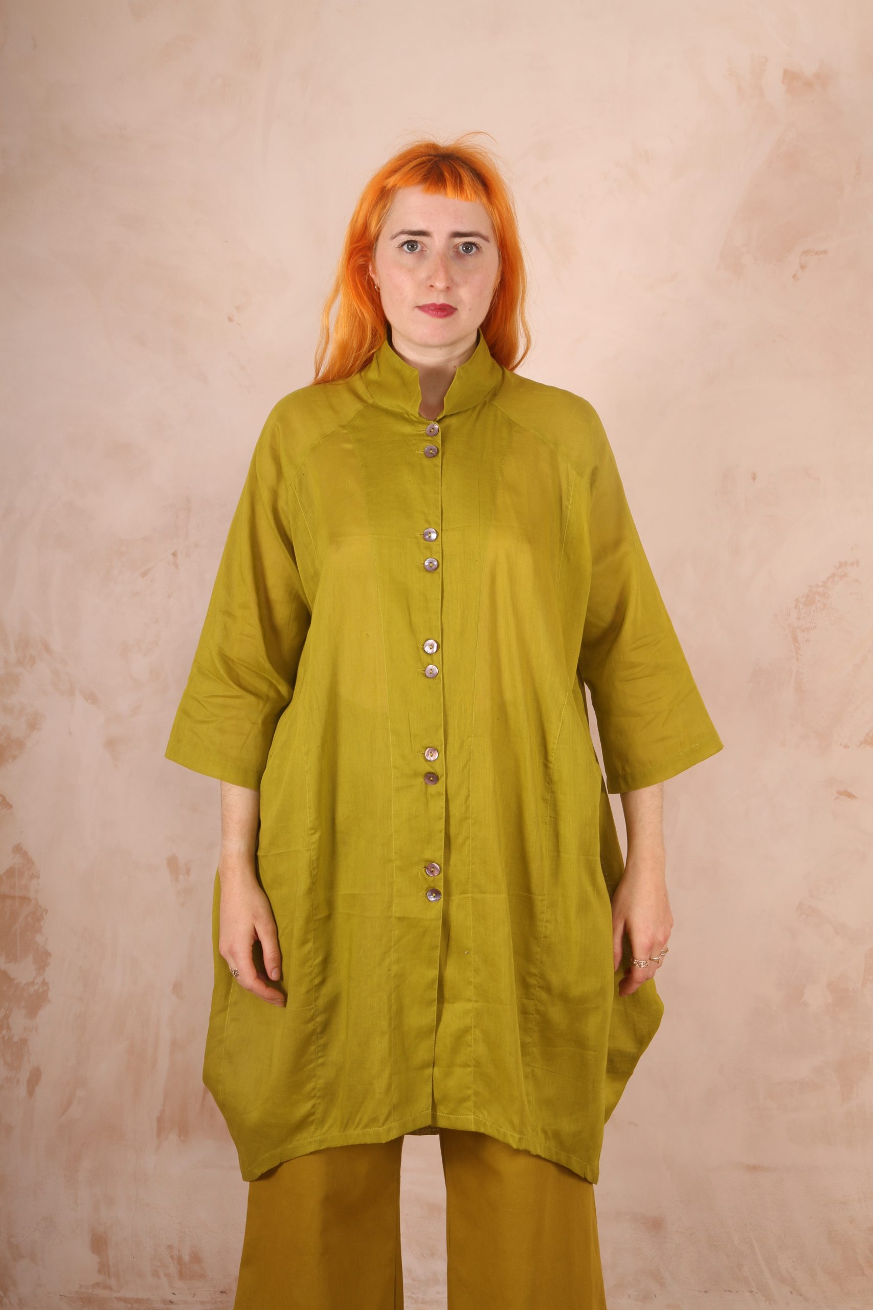 Made from a beautifully soft cotton voile, the Jasmine shirt is oversized and a Lagenlook shape. The shirt is loose and flattering. Panel detailing on the shoulders leads into a raglan sleeve . The sleeves are three quater length, emphasising the waist. The shirt is over the knee length and has a dipped hemline at the back. The natural shell buttons fasten with loops. The shirt has satisfyingly deep pockets