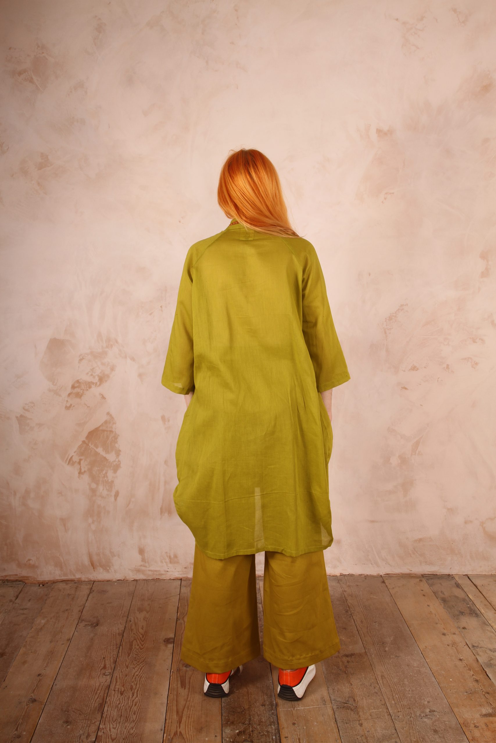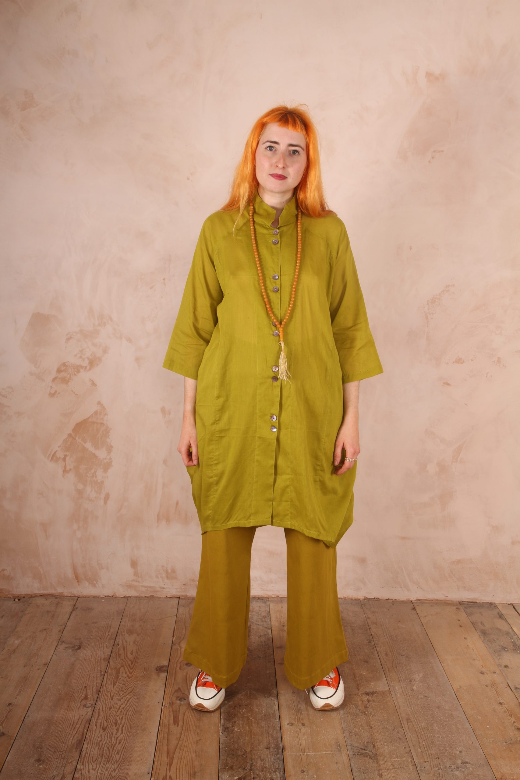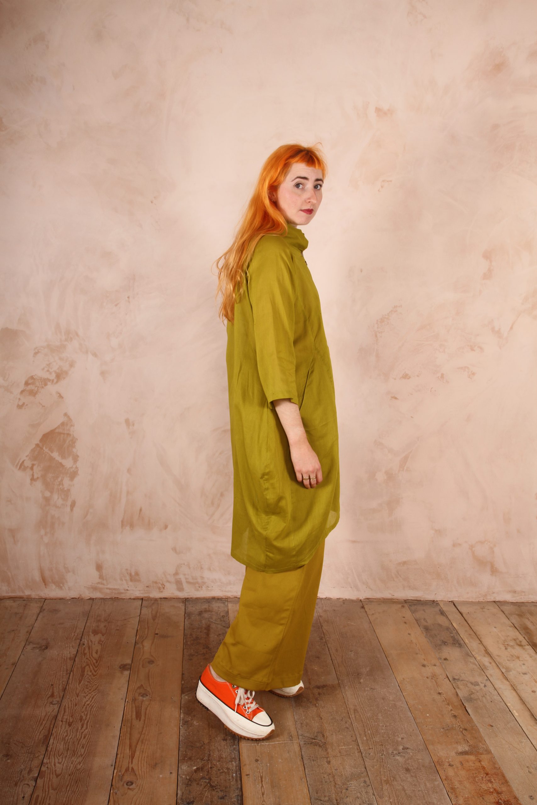 Made from a beautifully soft cotton voile, the Jasmine shirt is oversized and a Lagenlook shape. The shirt is loose and flattering. Panel detailing on the shoulders leads into a raglan sleeve . The sleeves are three quater length, emphasising the waist. The shirt is over the knee length and has a dipped hemline at the back. The natural shell buttons fasten with loops. The shirt has satisfyingly deep pockets