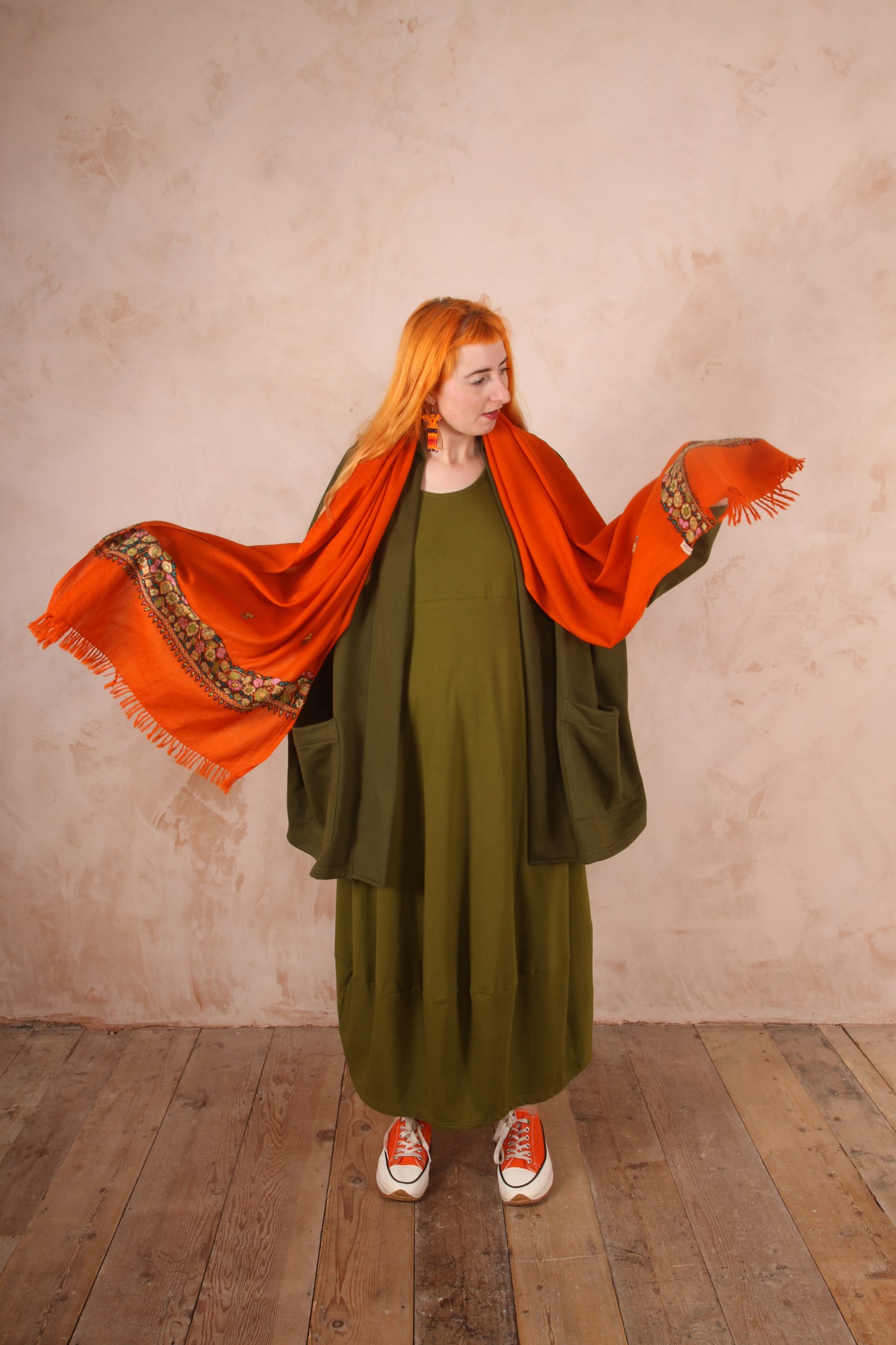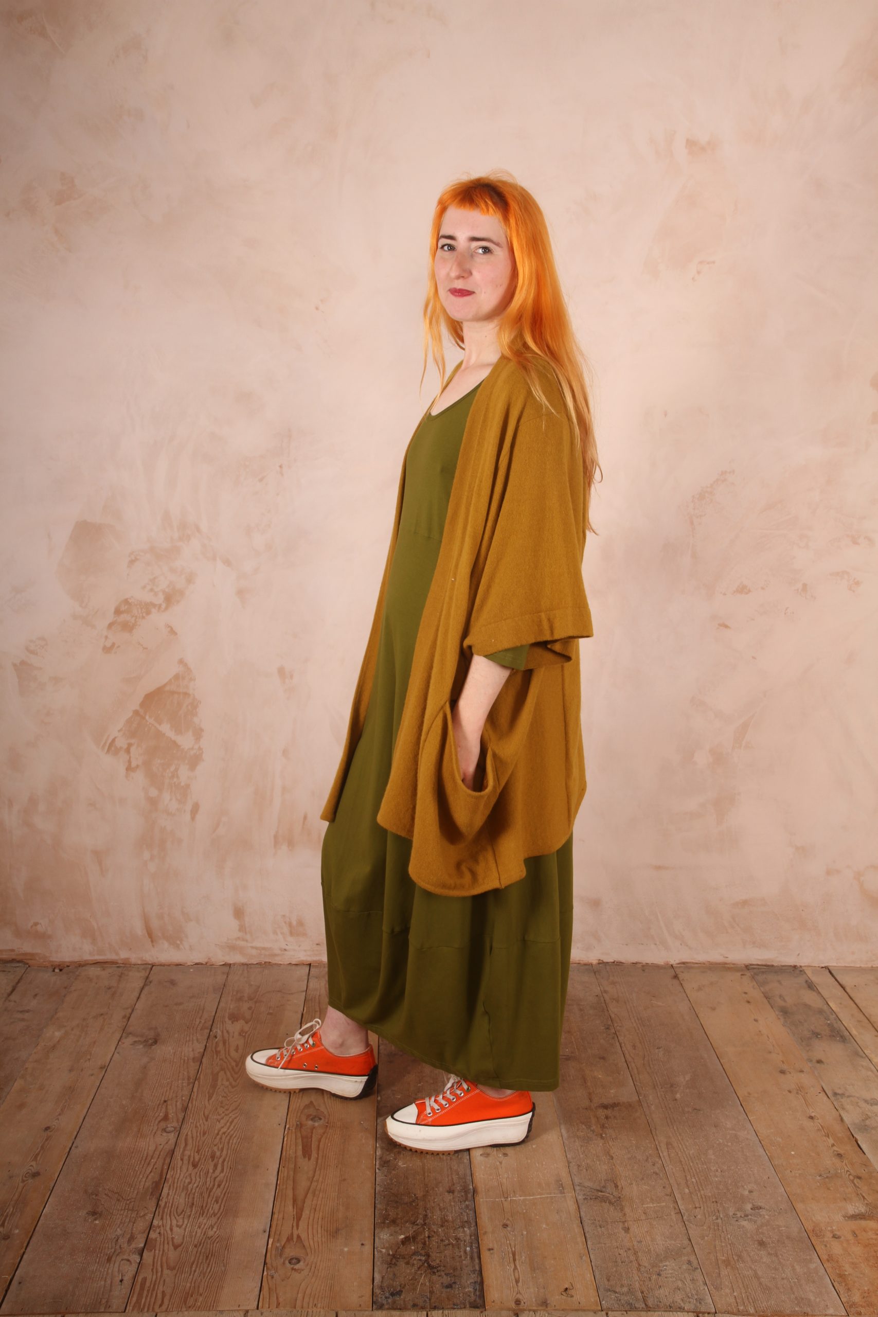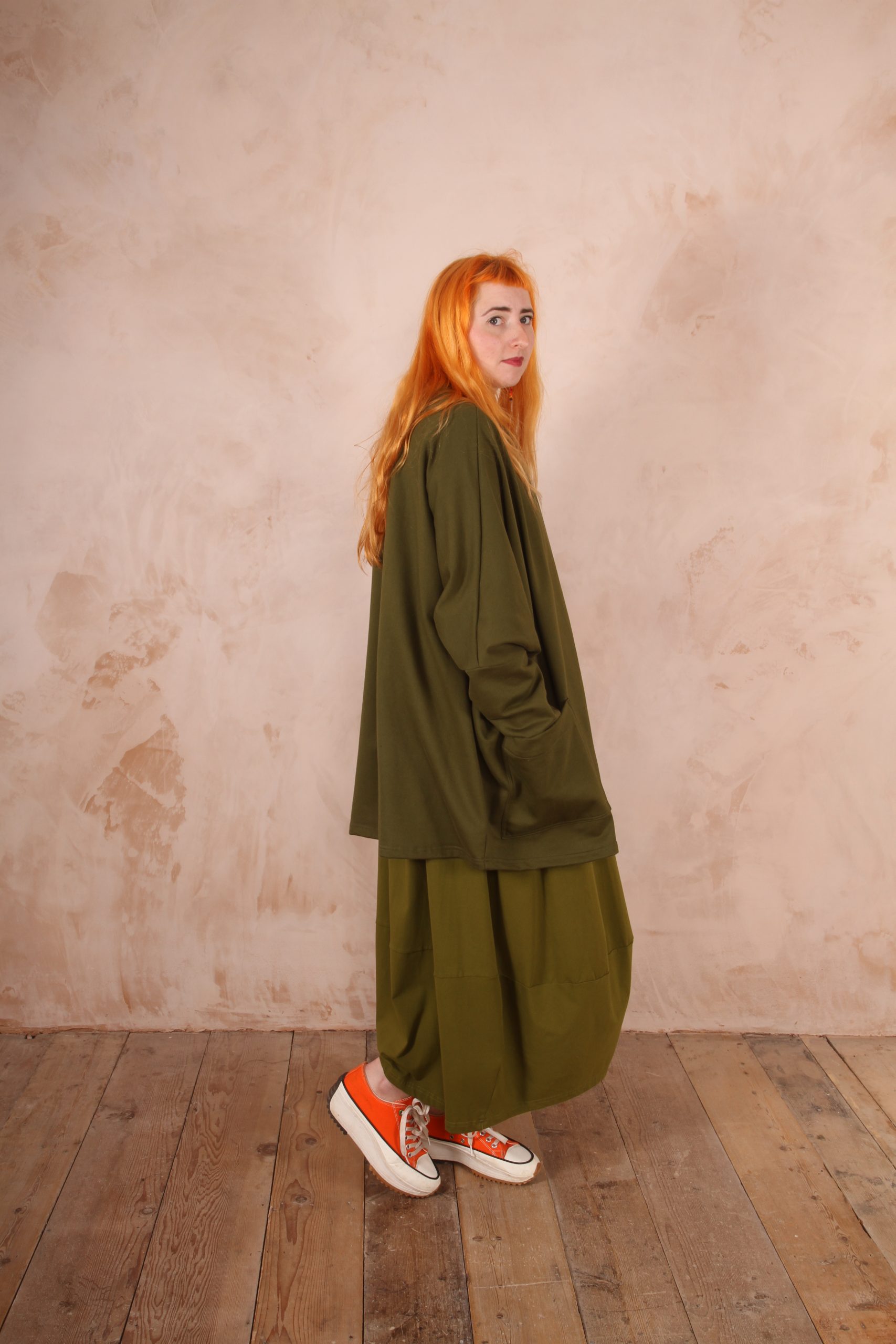 The Tierra Bubble Dress is a simple, easy fit oversized dress made from high quality jersey fabric. The low empire line/ high waistband curves gently downwards towards the side seams, echoing the lower panel which curves into a gentle balloon hem which is lower at the back hem of the dress.